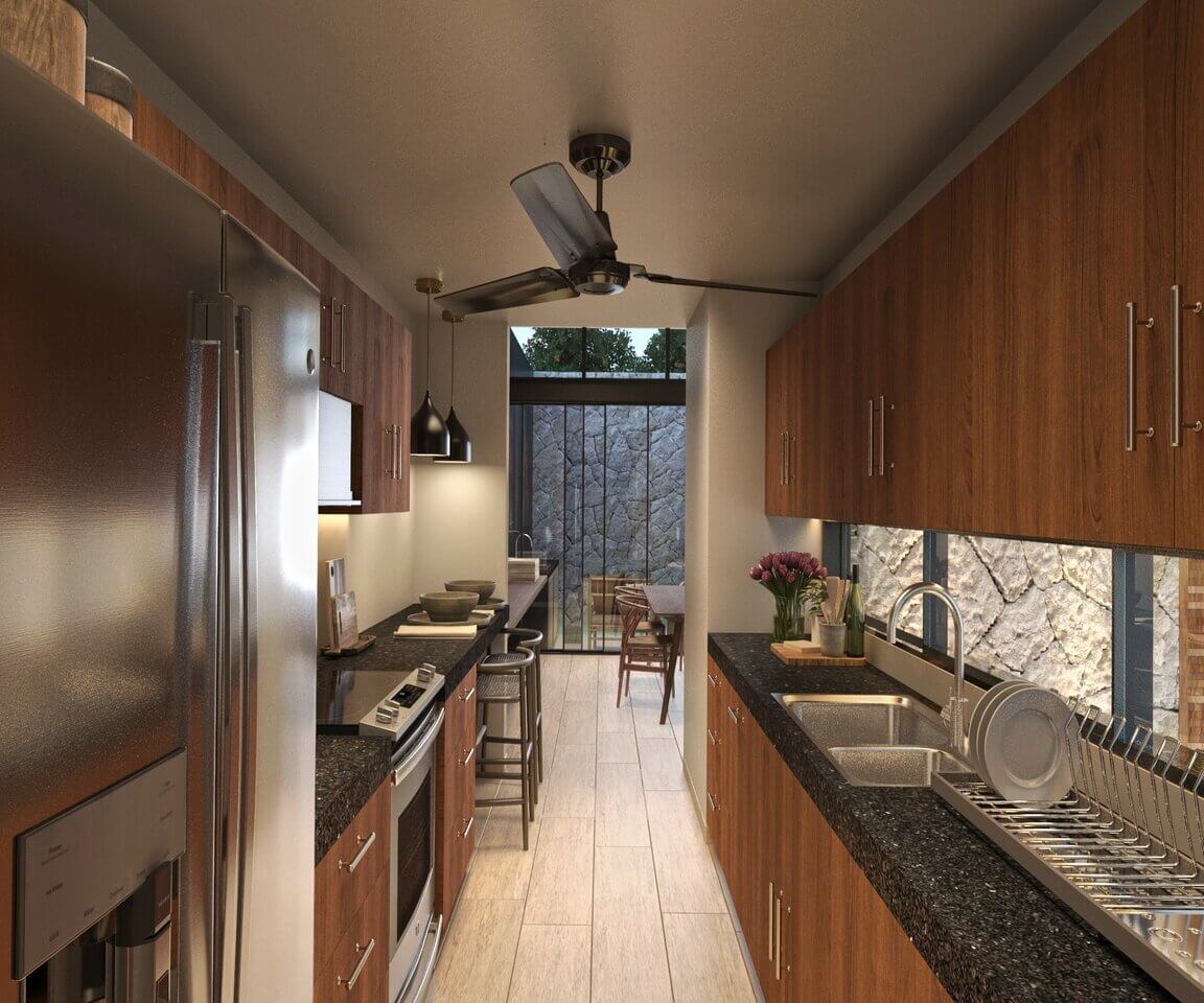 - Cocina equipada con gaveteros inferiores y superiores de caobilla