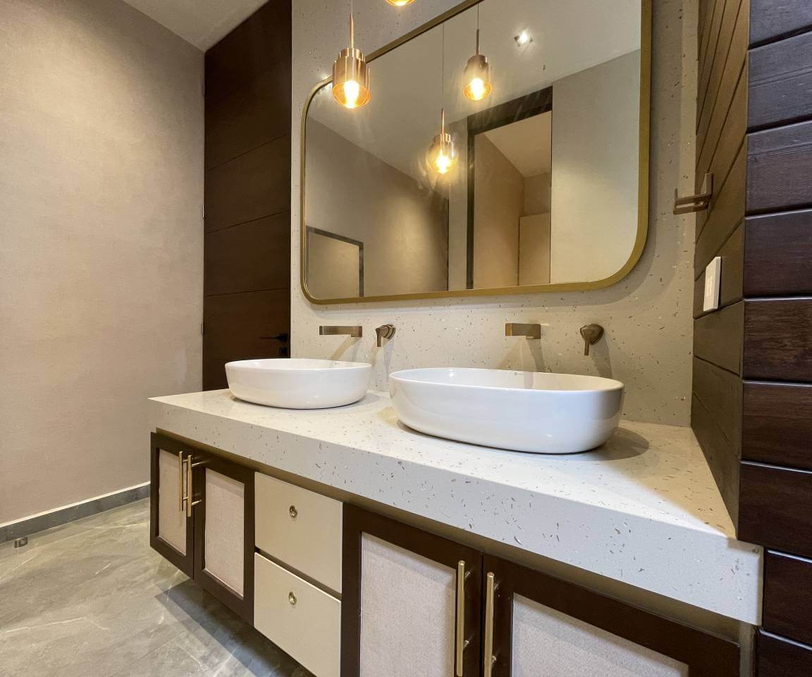 - Todos los baños cuentan con dobles lavabos, ya sean de sobreponer o integrados, cuentan con dobles espejos y recubrimientos de cuarzo italiano en cada meseta, cada baño tiene diseño diferente.