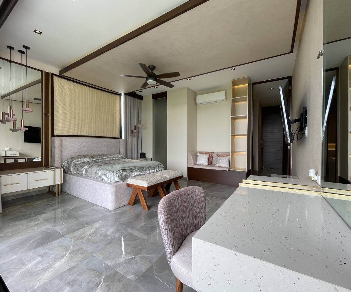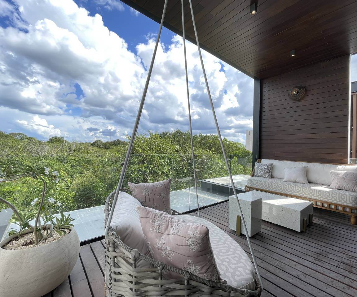 - Cada recamara tiene un diseño diferente, pero todas cuentan con buros de madera, mobiliario ya sea tocador, área de trabajo y muebles de televisión, lámparas colgantes de diseñador y balcones con pisos y techos de madera con barandal de cristal templado, mobiliario e iluminación y una vista a zona protegida.