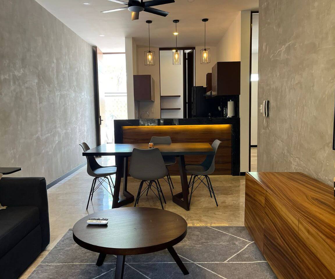 Hermoso departamento amueblado en renta en Santa Gertrudis Copo en planta baja. Ubicado en un conjunto departamental de 16 unidades dividido en 3 niveles, ubicados al norte de la ciudad de Mérida, en una zona con alta plusvalía gracias a su cercanía con desarrollos residenciales, rodeado de todos los servicios como centros comerciales, universidades y hospitales. A pocos minutos del periférico de Mérida, a 10 minutos del centro comercial La Isla y el hospital Faro del Mayab, a 28 minutos del Puerto de Progreso.