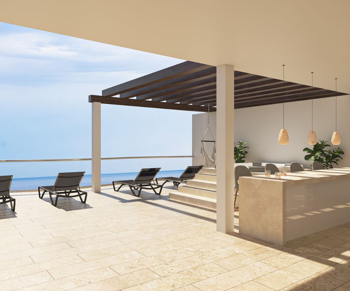 Condominio frente al mar con diseño moderno, acabados de lujo, amenidades y servicios a pie, como Hospital, Muelle de Chicxulub, Restaurantes, Reserva Ecológica y Supermercado.