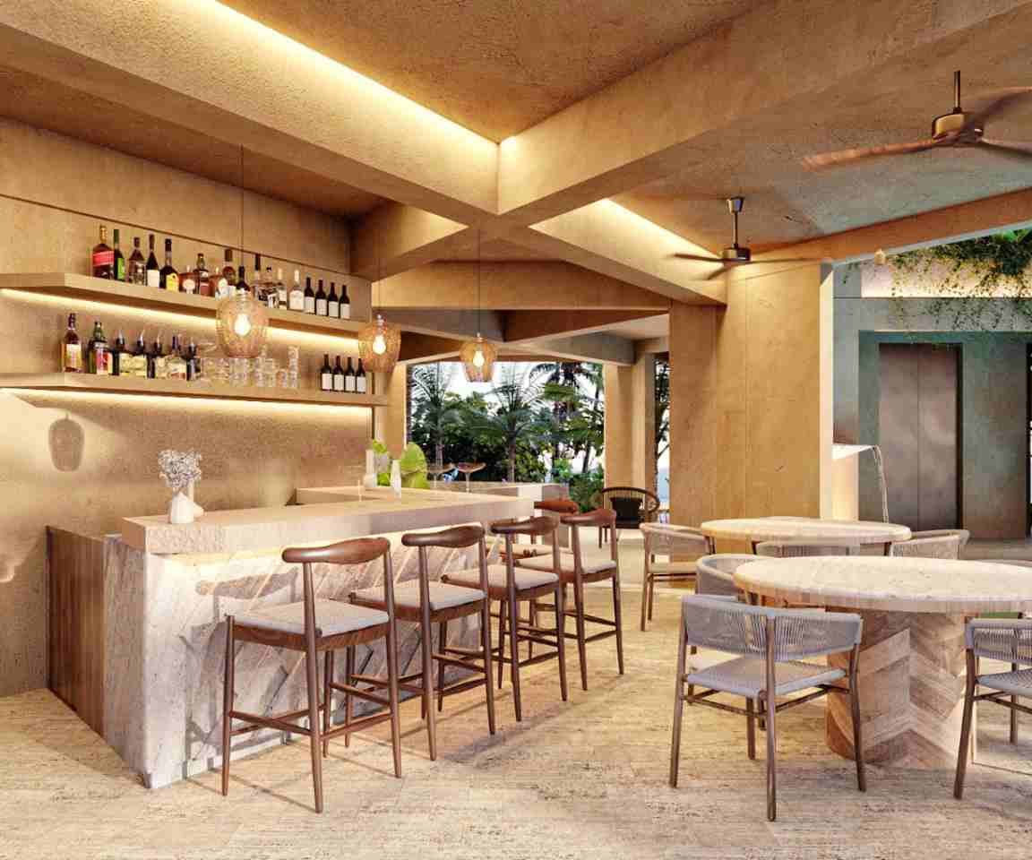 alberca con área social, lobby-recepción,lounge bar, gimnasio, mirador con vista litoral, área de meditación