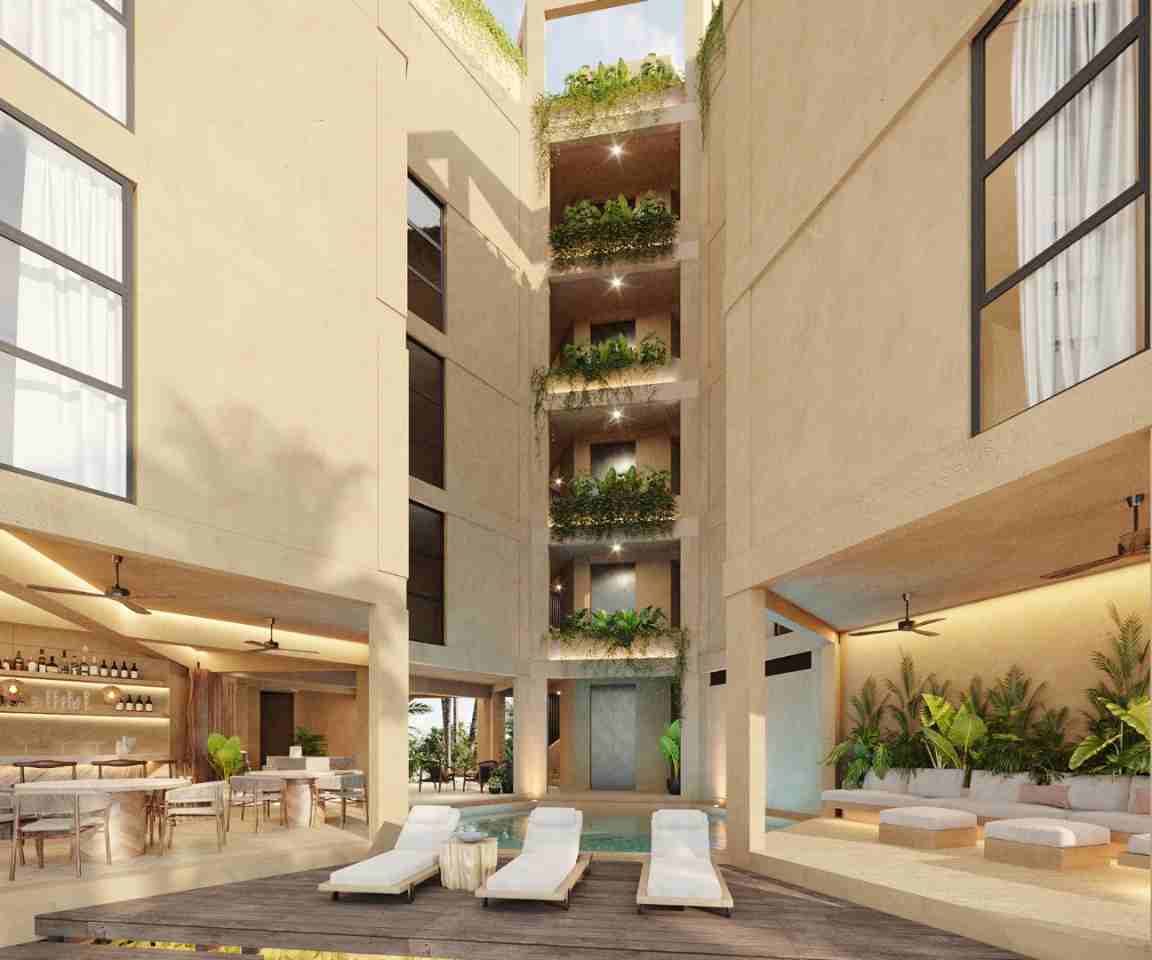 Descubre la exclusividad y serenidad de Mar de Miel, un conjunto de 13 departamentos en una torre de 5 niveles a la orilla de la playa, en San Crisanto, Yucatán. Este edificio, con un diseño de autor, ofrece amenidades que abrazan la elegancia y el confort con una cálida recepción y estancia, un íntimo loungebar, una refrescante área de piscina con camastros, un gimnasio, un mirador con vista litoral en el último nivel y un área oasis de meditación. Todo en armonía con las impresionantes vistas al mar